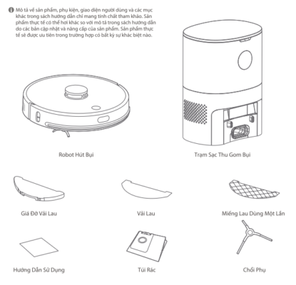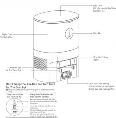 - Nếu không đủ pin trong quá trình dọn dẹp, robot sẽ tự động quay trở lại trạm sạc thu gom bụi để sạc. Sau khi quá trình sạc hoàn tất, robot sẽ quay trở lại vị trí đã được dọn dẹp cuối cùng để tiếp tục quá trình dọn dẹp.