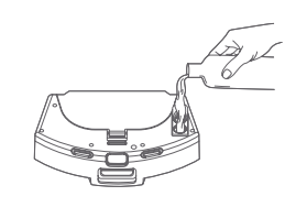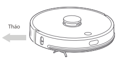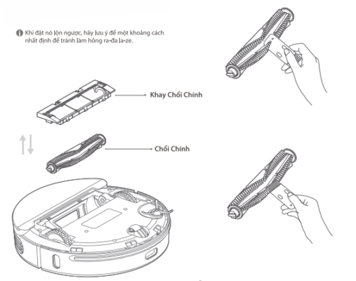- Khi đặt lộn ngược robot, hãy nhấn vào chốt ở trên nắp của chổi chính. Sau đó, tháo nắp và bàn chổi chính