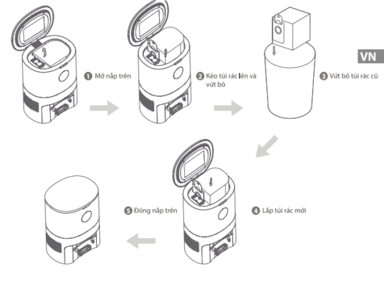 Khi túi rác đầy, đèn báo trên trạm sạc thu gom bụi sẽ sáng màu đỏ và đẩy thông báo ở trên ứng dụng. Hãy thay thế túi rác kịp thời.