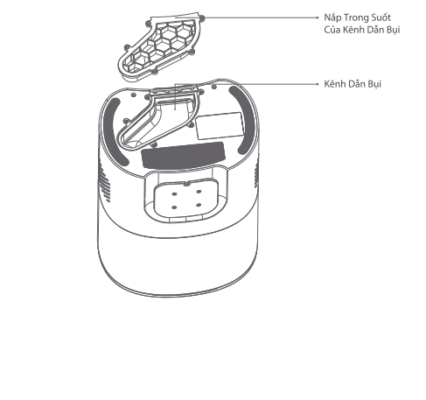 Tham khảo sơ đồ bên dưới nếu kênh bụi bị chặn. Dùng tuốc nơ vít tháo nắp trong suốt của kênh dẫn bụi và loại bỏ bất kỳ vật lạ nào.