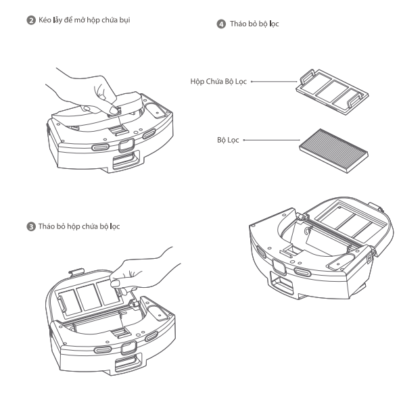 - Sau khi làm sạch bên trong hộp chứa bụi, hãy đảm bảo rằng bên trong hộp khô và không có nước. Nếu không, trạm sạc thu gom bụi sẽ bị hư hỏng.