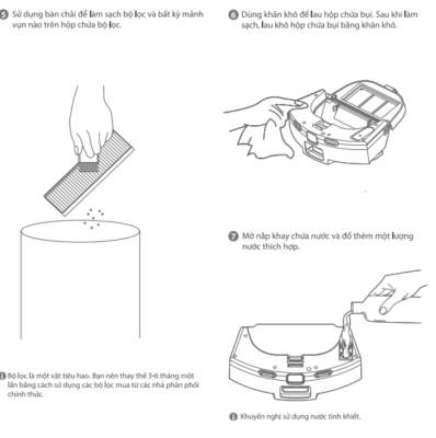 - Trước khi vệ sinh, bảo dưỡng sản phẩm cũng như trạm sạc, hãy tắt thiết bị và rút phích cắm để ngắt nguồn điện. Không được để Robot, trạm sạc xuống nước hoặc rửa chúng bằng nước.