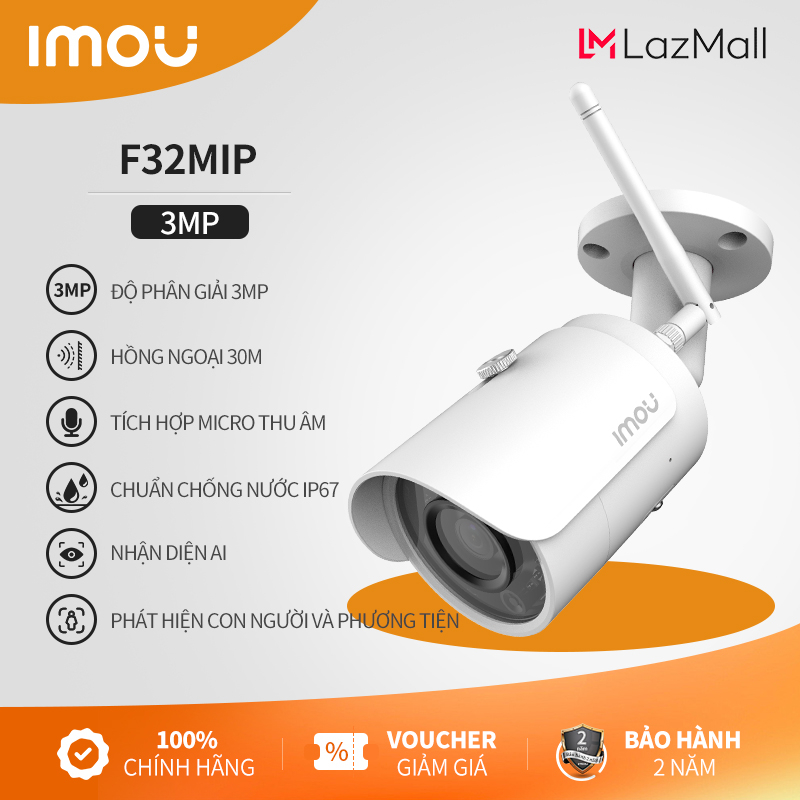 Camera Imou IPC-F32MIP với ưu điểm sản phẩm có độ phân giải FullHD 3.0 Megapixel; camera tích hợp míc ghi âm, tiêu chuẩn chống nước IP67 hoàn toàn yên tâm khi lắp đặt ngoài trời, kết nối wifi, hỗ trợ các tính năng thông minh như phát hiện chuyển động, phát hiện con người, ống kính có góc quan sát rộng tới 115 độ giúp bạn quan sát bao quát toàn cảnh. Camera tích hợp hồng ngoại thông minh quan sát ban đêm lên tới 30m. Với các tính năng ưu việt và giá thành rẻ đây là sản phẩm camera phù hợp lắp đặt ngoài trời.