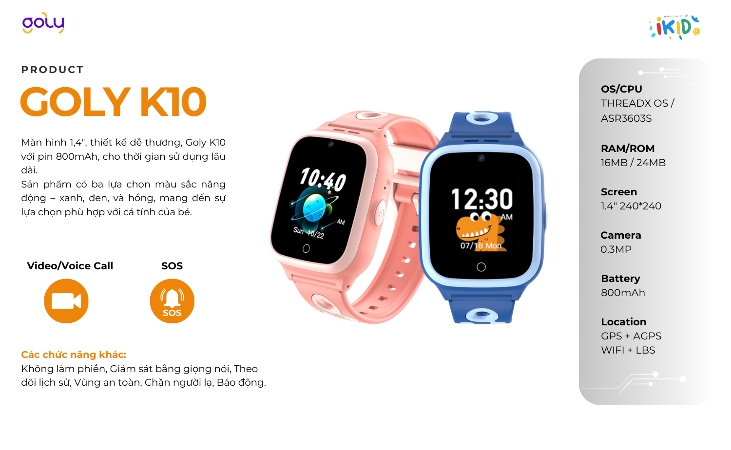 Đồng hồ trẻ em GOLY K10 sở hữu màn hình cảm ứng kích thước 1.44 inch với độ phân giải sắc nét, bộ xử lý mạnh mẽ, thời lượng pin dài. Đồng hồ có hỗ trợ định vị LBS, GPS, bên cạnh đó Goly Kidwatch K10 cũng tích hợp tính năng gọi điện, tin nhắn và bảo mật tốt với khả năng chống nước IP67, cùng với dây đeo bền bỉ, thoải mái phù hợp cho trẻ em.